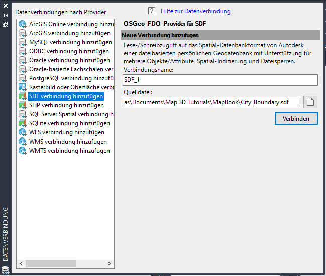 • Klicken Sie unter Quelldatei (rechts) auf die Durchsuchen-Schaltfläche, und navigieren Sie zur Beispieldatei City_Boundary.sdf. Klicken Sie auf Verbinden.