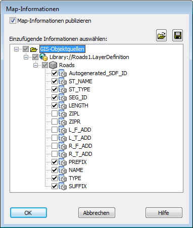 - Erweitern Sie im Dialogfeld Map-Informationen die Elemente in der Liste, und wählen Sie die Elemente Roads und Parcels.