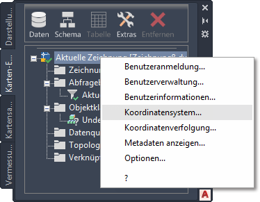 • Klicken Sie mit der rechten Maustaste auf den Eintrag Aktuelle Zeichnung, und wählen Sie dann Koordinatensystem.