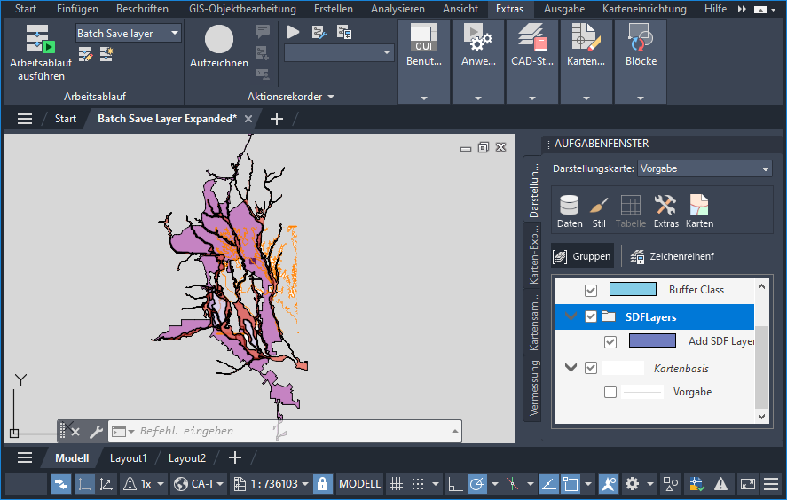 Wenn Sie den Arbeitsablauf ausführen, zeigt das AutoCAD Map 3D-Toolset eine Liste der SDF-Dateien im angegebenen Ordner an. Anschließend wird eine Gruppe in der Darstellungsverwaltung erstellt, die die erstellten Layer enthält. Es wird eine Verbindung zu den SDF-Dateien im angegebenen Ordner hergestellt. Für jede Zeichnung im angegebenen Ordner wird eine Verbindung hergestellt und ein Layer zur Darstellungsverwaltung hinzugefügt, und die Layer werden in die neue Gruppe verschoben.
