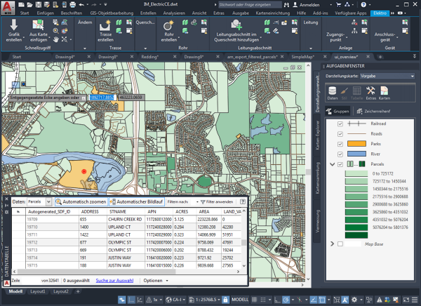 Diese Karte hat Darstellungsverwaltungslayer für Eisenbahnlinien, Straßen, Parks, den Fluss und Parzellen. Jeder weist einen anderen Stil auf. Eine Übersicht über die Komponenten des AutoCAD Map 3D-Toolset-Fensters finden Sie unter Lektion 2: Kurzübersicht über AutoCAD Map 3D-Toolset.