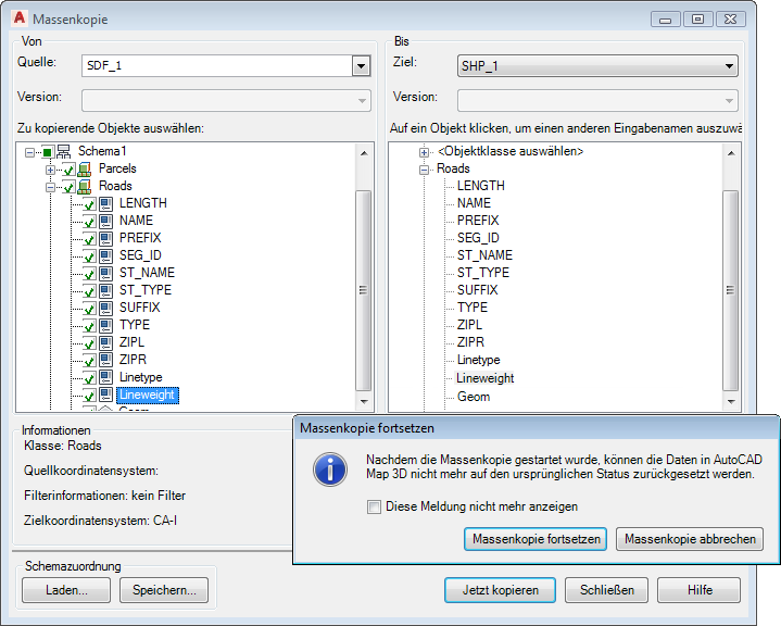 Kopieren Sie den Layer Roads mit der Funktion Massenkopie vom SDF-Format in das SHP-Format.