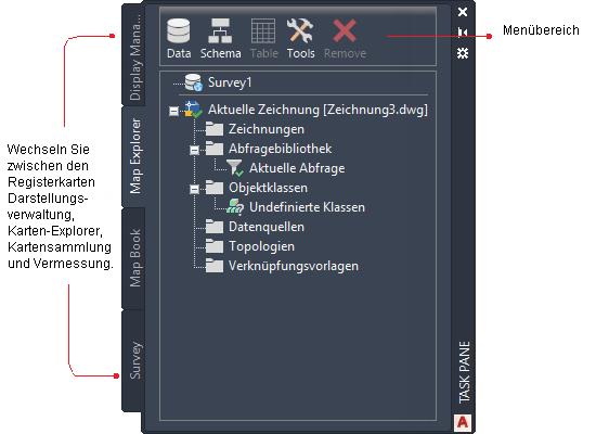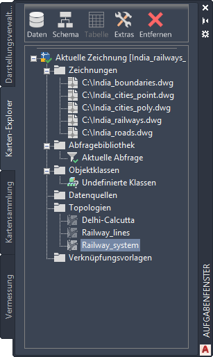Über das Aufgabenfenster können Sie schnell auf häufig verwendete Objekte zugreifen und diese in aufgabenbezogenen Ansichten gruppieren. Mit dem Aufgabenfenster können Sie Karten erstellen, verwalten, anzeigen und publizieren.