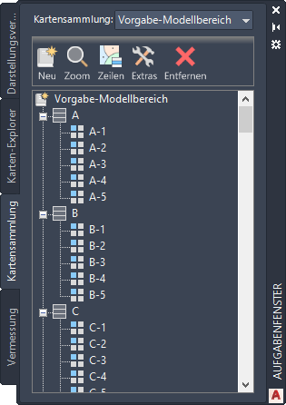 Erstellen Sie über die Registerkarte Kartensammlung gedruckte Karten, Kartensammlungen und mehrseitige DWF-Dateien aus stilisierten Karten. Kartensammlung nutzt die Funktionen des Managers für Planungsunterlagen von AutoCAD. Ähnlich wie die Seiten in einem Atlas werden die Kacheln der Kartensammlung in einer Strukturansicht angezeigt. Verwenden Sie die Navigationspfeile, um zwischen den Kacheln in der Karte zu wechseln.