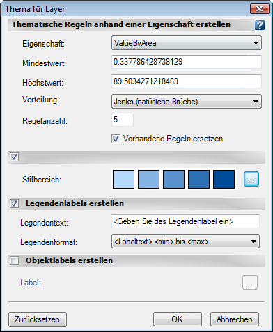Mit der Jenks'schen Verteilungsmethode werden Objektbereiche an den natürlichen Brüchen gruppiert, sodass Objekte mit ähnlichen Werten zusammengefasst werden. Mit dieser Methode werden die natürlichen Gruppierungen der Daten erkannt, anstatt erzwungene Bruchpunkte zu erstellen.