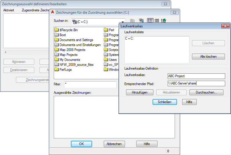 Mit einem Laufwerksalias können mehrere Benutzer denselben Pfadnamen für eine Zeichnung auf einem freigegebenen Laufwerk verwenden. Jeder Benutzer kann diesem Laufwerk einen anderen Laufwerksbuchstaben zuweisen.