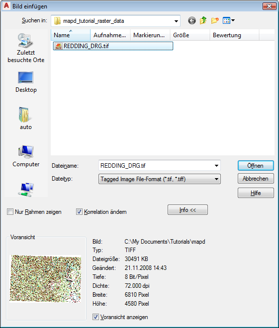 Übersichts- und Satellitenfotos enthalten häufig Informationen zu Position und Maßstab. Durch diese Informationen werden die Bilder "georeferenziert". AutoCAD kann diese Georeferenzierungsdaten nicht verwenden und die Bilder daher nicht richtig platzieren. Das AutoCAD Map 3D-Toolset ist dazu jedoch in der Lage.