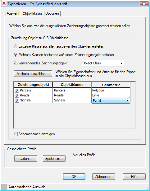 Die neue SDF-Datei enthält für jede ausgewählte Objektklasse eine GIS-Objektklasse. Die Eigenschaften der einzelnen GIS-Objektklassen entsprechen den Attributen der entsprechenden Objektklasse.
