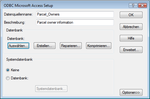 - Geben Sie im Dialogfeld ODBC-Setup für Microsoft Access im Feld Datenquellennamen den Namen Parcel_Owners ein.