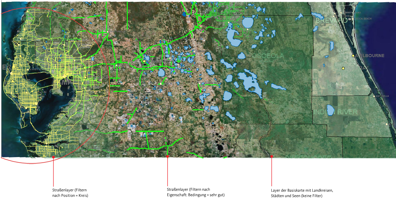 Mit einem Eigenschaftenfilter und einem Positionsfilter können Sie die Straßenbedingungen in einem kreisförmigen Gebiet anzeigen.
