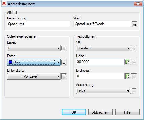 Der Anmerkungstext wird blau und mit einer Höhe von 30 Einheiten dargestellt.