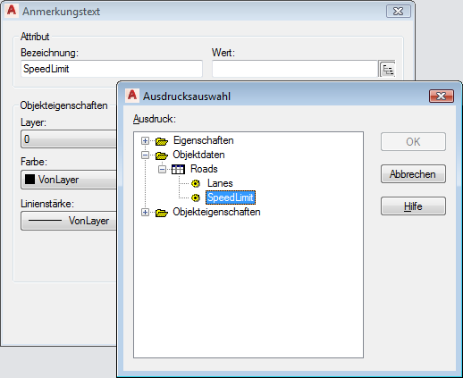 Falls Ihre Zeichnung Objektdaten enthält oder mit externen Daten verknüpft ist, können Sie Eigenschaften dieser Daten als Werte für die Anmerkung verwenden. Diese Eigenschaften sind dynamisch. Wenn Sie die Anmerkung Objekten zuordnen, wird bei jedem Objekt ein eigener Wert für diese Eigenschaft angezeigt.