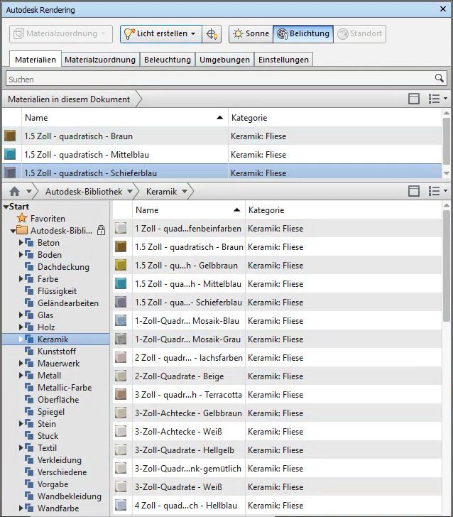 Durchsuchen Sie auf der Registerkarte Materialien die Autodesk-Bibliothek und wählen Sie einen Materialtyp durch Klicken aus.