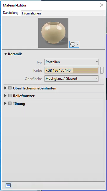 Geben Sie auf der Registerkarte Darstellung die Materialeigenschaften und die Farboptionen an.
