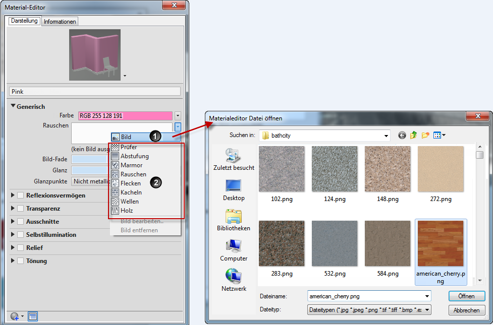Sie können der Farbe eines Materials Texturen zuweisen.