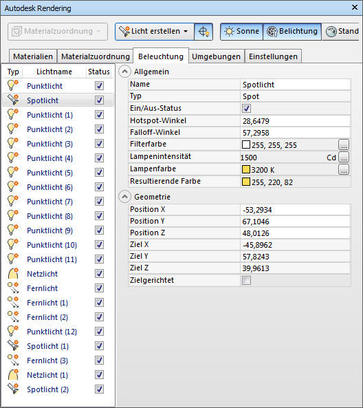 Die einzelnen Lichtquellen, die Sie dem Modell hinzufügen, werden in der Lichtquellenansicht nach Name und Typ aufgeführt. Mithilfe des Kontrollkästchens Status können Sie die Lichtquellen aktivieren bzw. deaktivieren. Wenn Sie mit der rechten Maustaste auf eine Lichtquelle klicken, wird ein Kontextmenü angezeigt. Durch Klicken auf eine Lichtquelle wird diese ausgewählt, und in der Eigenschaftenansicht werden die zugehörigen Eigenschaften angezeigt. Sonnen- und Himmelslicht sind nicht enthalten. Sie können die Sonnen- und Himmelslicht-Eigenschaften jedoch auf der Registerkarte Umgebungen anpassen.
