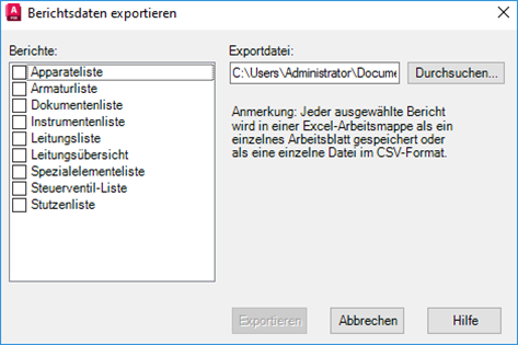 Anmerkung: Die Schaltfläche Export wird erst dann aktiviert, wenn Sie einen oder mehrere Berichtstypen ausgewählt haben und eine Exportdatei angegeben haben.