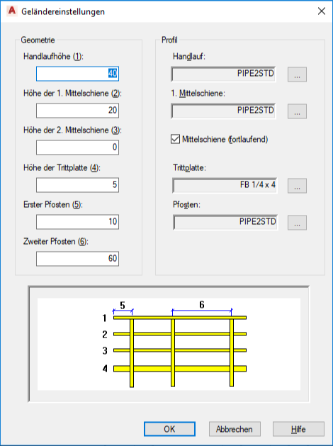 Legt die Geometrieeinstellungen für Geländer fest. In Klammern angegebene numerische Werte entsprechen der beschrifteten Geometrie im Vorschaubild.