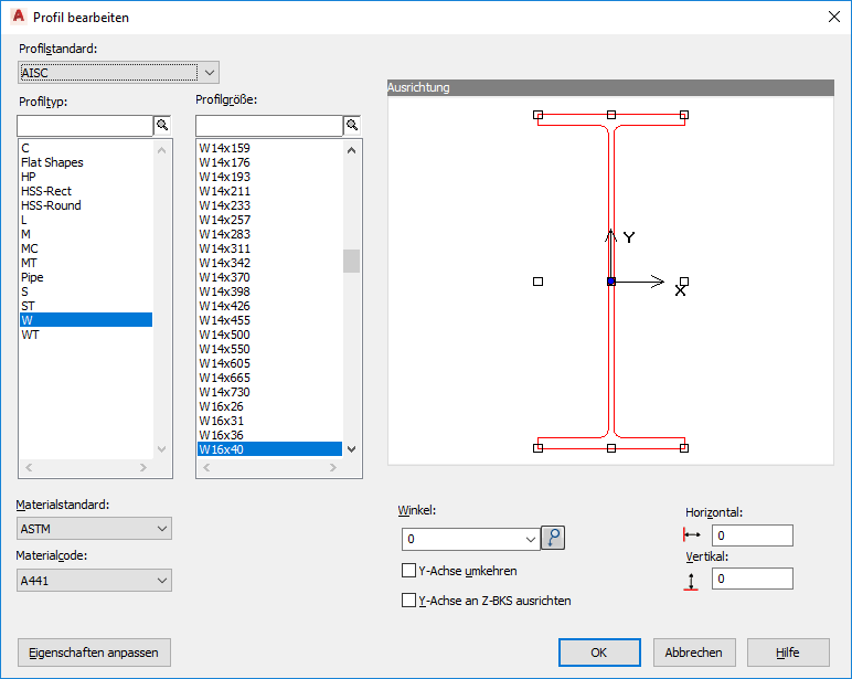 Fordert Sie auf, auf ein Profil im Zeichnungsbereich zu klicken, und trägt Werte in die Felder ein, die mit den Werten des gewählten Profils identisch sind.