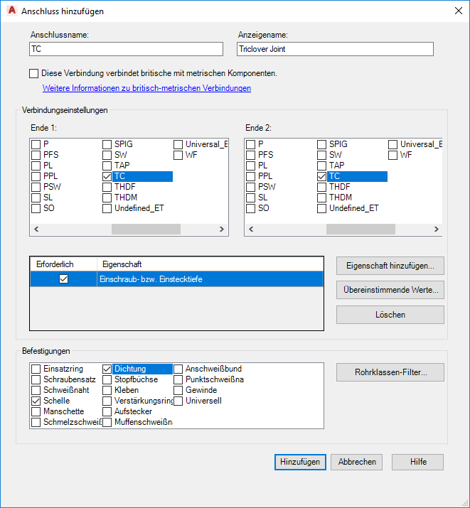Verbindungstypen, die britisch-metrische Verbindungen unterstützen, sind von Verbindungstypen für Verbindungen zwischen denselben Einheiten getrennt. So können Sie Zuordnungseigenschaften festlegen, z. B. 150#, 10PN.