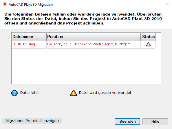 Die Migration nach AutoCAD Plant 3D toolset kann erst erfolgen, wenn das Projekt und die verknüpften Zeichnungen verfügbar und gesperrt sind.