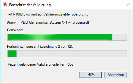 Der Validierungsvorgang nimmt je nach Größe des Projekts oder der Zeichnung und je nach Anzahl der Zeichnungen im Projekt einige Minuten in Anspruch. Fortschrittsbalken zeigen an, wie lange die Validierung in etwa dauert.