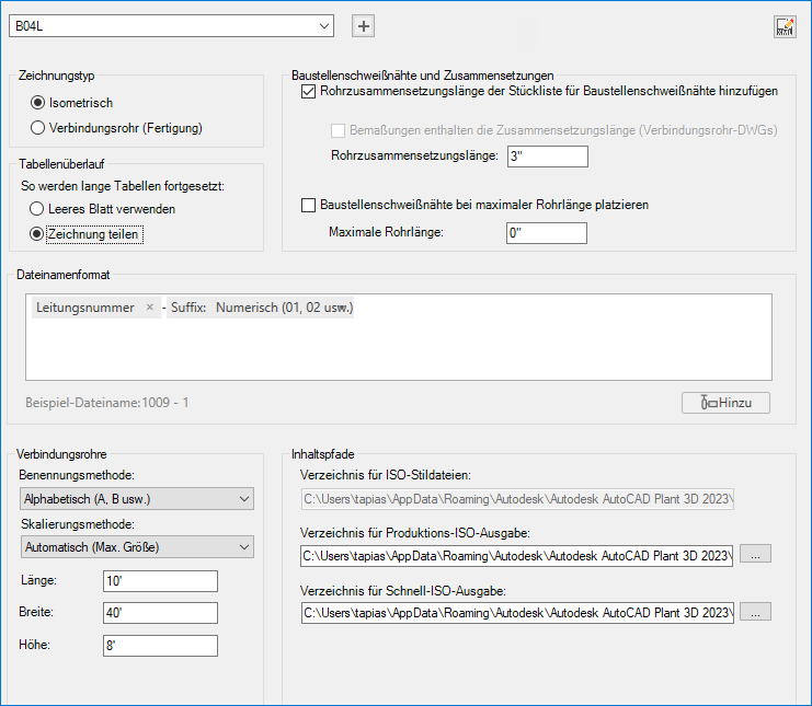 Erstellt und konfiguriert ISO-Stile für Rohrleitungs-ISOs und Verbindungsrohrzeichnungen. Legt die Pfade und Verzeichnisse fest, unter denen isometrische Zeichnungen gespeichert werden.
