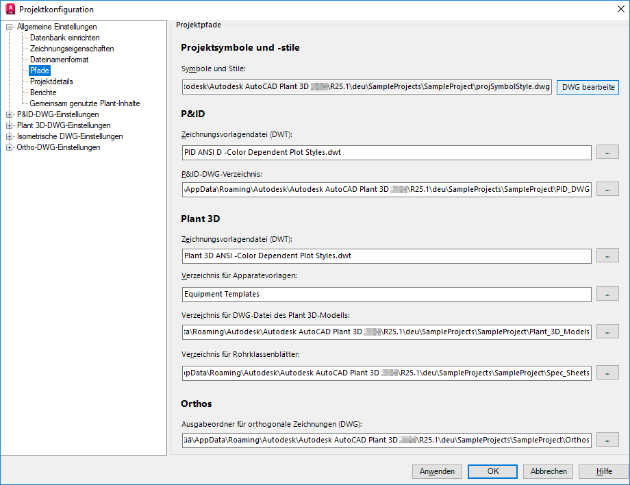 Erweitern Sie in der Strukturansicht des Dialogfelds Projektkonfiguration den Eintrag Allgemeine Einstellungen, und klicken Sie auf Pfade.