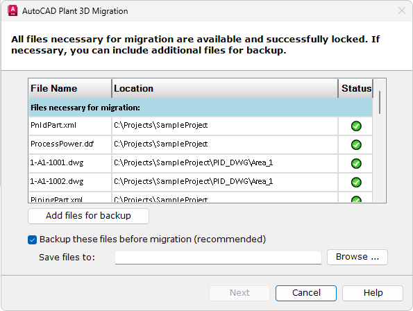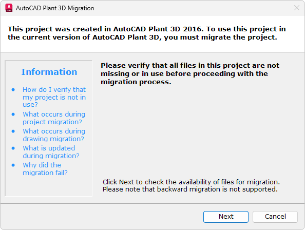 4. Vergewissern Sie sich, dass das Projekt und die verknüpften Zeichnungsdateien geschlossen sind. Klicken Sie auf der Seite zum Starten der Projektmigration auf Weiter.