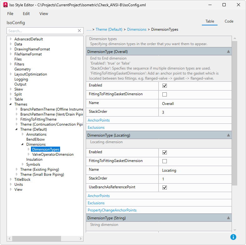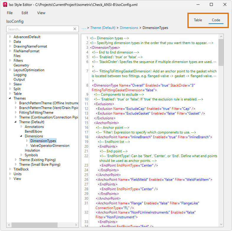 Der ISO-Stil-Editor zeigt die entsprechende Datei IsoConfig.xml für erweiterte isometrische Anpassungen an. Klicken Sie im Dialogfeld Projektkonfiguration auf der Seite ISO-Einstellungen auf .
