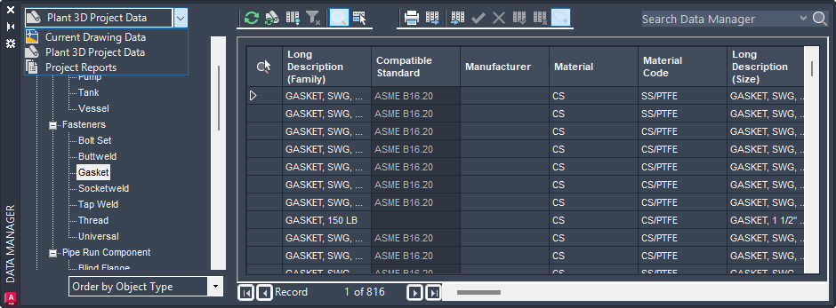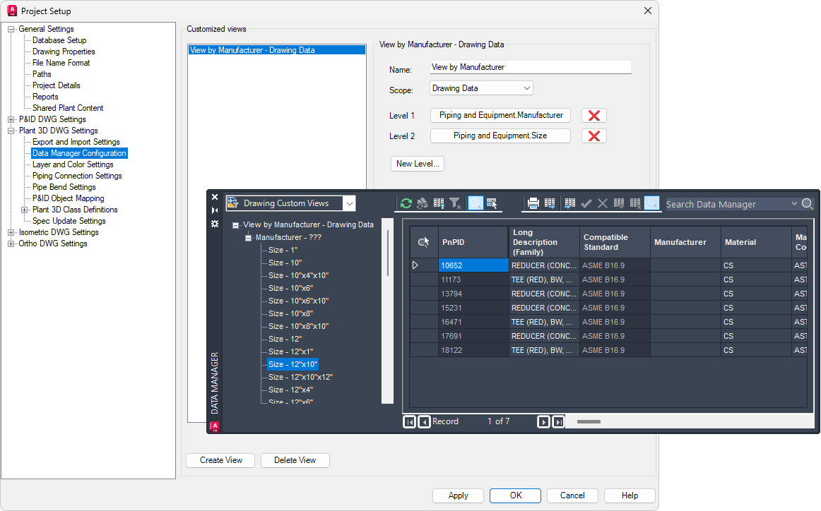 Sie können auch benutzerdefinierte Ansichten Ihrer Plant-Objektdaten erstellen, sodass eine beliebige Eigenschaft hervorgehoben wird. In diesem Beispiel ist die Eigenschaft Hersteller so festgelegt, dass sie auf oberster Ebene in der Strukturansicht des Datenmanagers angezeigt wird. Sie können Eigenschaften auch auf verschiedenen Ebenen verschachteln, um die Ansicht zu verfeinern.