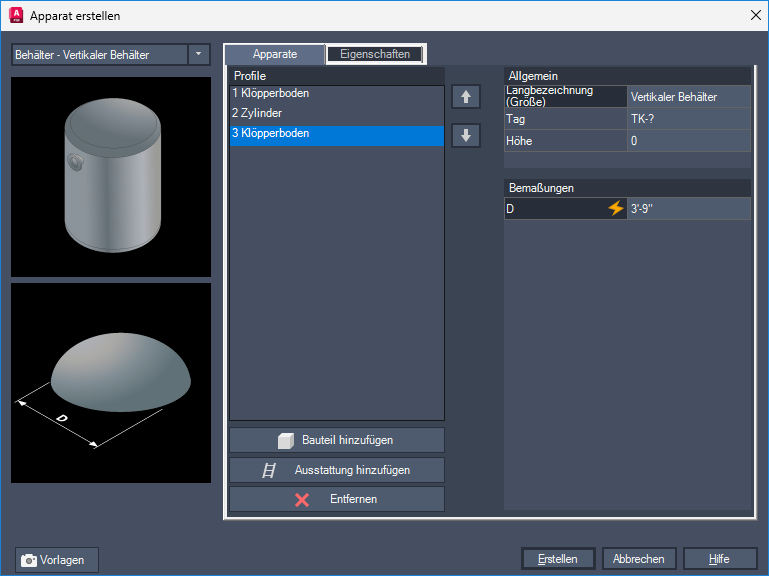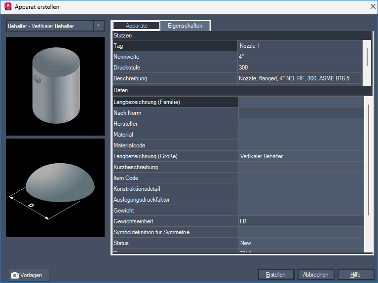 Klicken Sie in der Dropdown-Liste Erstellen von Apparaten auf eine Apparateklasse (z. B. Behälter). Klicken Sie im Flyout-Menü auf Neu <Apparatetyp> (z. B. Neuer vertikaler Behälter).