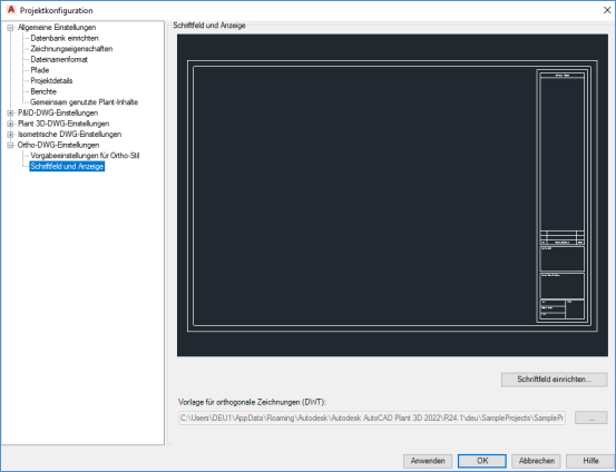- Zeigt die kontextabhängige Multifunktionsleisten-Registerkarte Schriftfeld einrichten an. Wenn Sie auf Ortho-Einstellungen klicken, wird das Dialogfeld Einstellungen für orthogonale Generierung angezeigt, in dem Sie den Layer für die Ortho-Komponenten angeben können.
