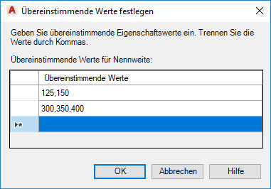 Identifiziert kompatible Eigenschaftswerte. Sie können auf jeder Zeile durch Komma getrennte Werte hinzufügen, um eine Übereinstimmung anzugeben (Bespiel: 125, 150).
