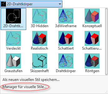 2. Klicken Sie in der Palette des Managers für visuelle Stile auf Verfügbare visuelle Stile in der Zeichnung 2D-Drahtmodell.