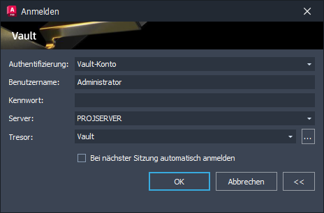 5. Klicken Sie auf OK. Sie werden nun für die aktuelle Sitzung beim Vault angemeldet.