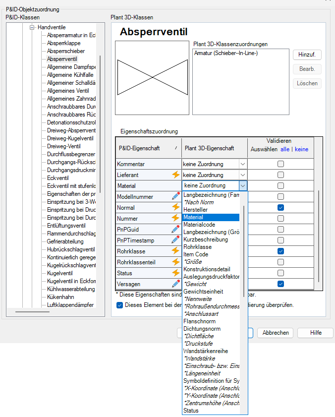 - Klicken Sie in der Spalte Plant 3D-Eigenschaft auf die entsprechende 3D-Eigenschaft (z. B. Material).