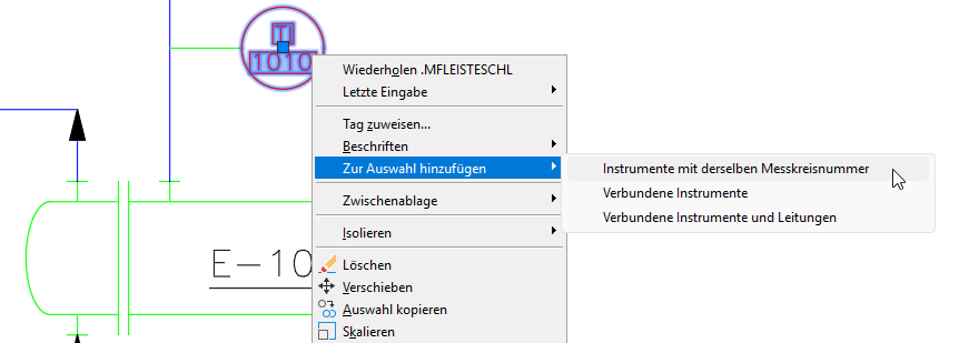 - Instrumente: Klicken Sie mit der rechten Maustaste auf ausgewählte Instrumente in einer P&ID-Zeichnung, und wählen Sie im Kontextmenü die Option Zu Auswahl hinzufügen aus.