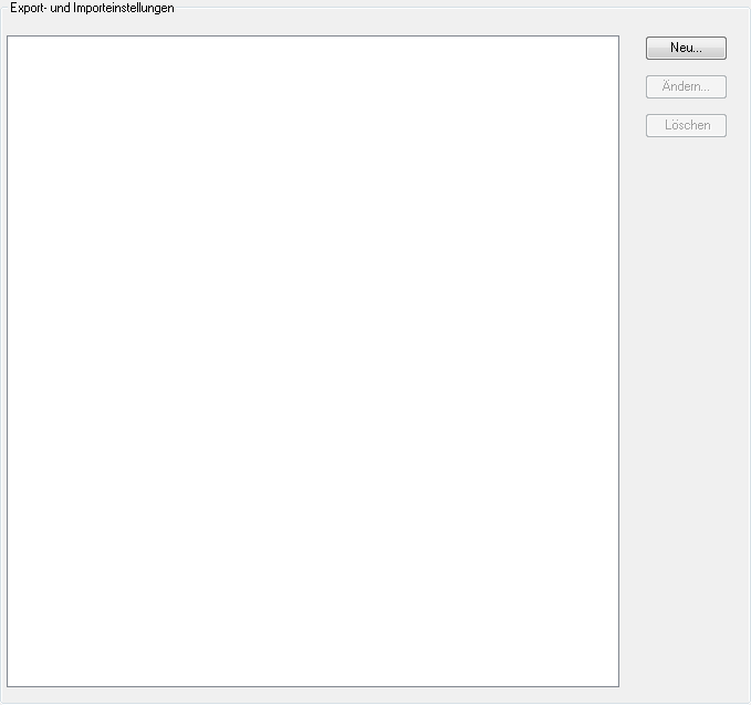 Im Fenster Export- und Importeinstellungen sind die gegenwärtig verfügbaren Export- und Importeinstellungen aufgelistet. Der Export und der Import verfügen über eine gemeinsame Konfiguration, sodass die gleichen Einstellungen sowohl für den Export als auch für den Import von Daten verwendet werden können.