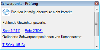 Wenn der Live-Schwerpunkt aktiviert ist und Sie ein Plant-Objekt ohne Gewicht auswählen, wird ein Validierungsfenster geöffnet, in dem Sie die Komponenten ohne Gewicht identifizieren können. Die Validierung von Live-Schwerpunkten ist nicht verfügbar, wenn keine ausgewählte Komponente über ein Gewicht verfügt.