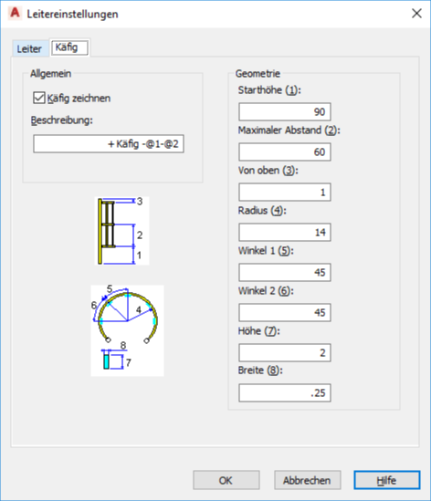 Legt die Geometrieeinstellungen für den Käfig fest. In Klammern angegebene numerische Werte entsprechen der beschrifteten Geometrie im Vorschaubild.