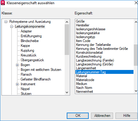 - Klicken Sie im Dialogfeld Klasseneigenschaft auswählen unter der Liste Klasse auf Leitungskomponente.