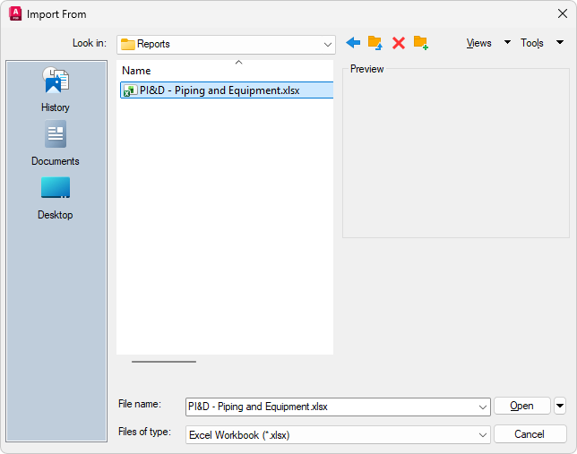 Anmerkung: Beim Importieren einer Excel-Tabelle können Sie an den Knoten Projektberichte oder an einen einzelnen Berichtsknoten importieren. Beim Importieren einer CSV-Datei können Sie nur an einen einzelnen Berichtsknoten importieren. Die importierten Daten müssen in jedem Fall mit dem gewählten Knoten übereinstimmen, z. B. Ventildaten zu einer Ventilliste oder Apparatedaten zu einer Apparateliste. Andernfalls werden die Daten ignoriert.