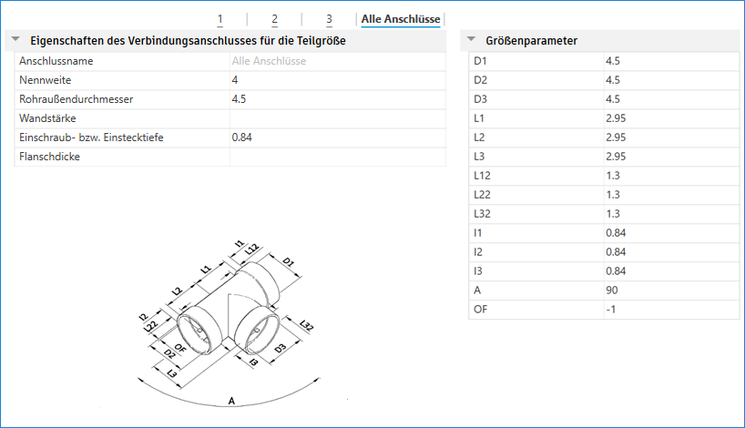 - Geben Sie unter Eigenschaften des Verbindungsanschlusses für die Teilgröße in das Feld Nenndurchmesser einen Nenndurchmesser (z. B. 1) ein.