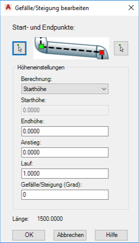 Legt die Methode zum Berechnen des Gefälles bzw. der Steigung fest. Sie können eine neue Starthöhe oder eine neue Endhöhe angeben oder ein neues Gefälle bzw. eine neue Steigung berechnen.