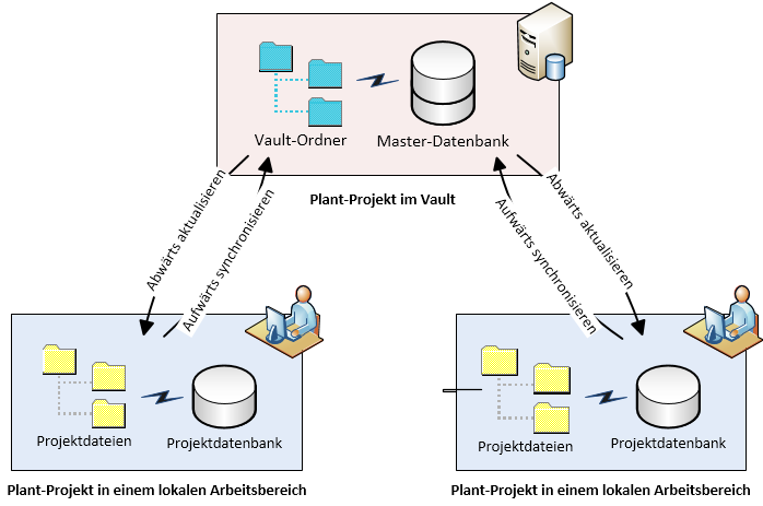 Wenn Sie ein Plant-Projekt mithilfe des Projektmanagers zum ersten Mal vom Vault aus öffnen, wird ein lokaler Arbeitsbereich erstellt, und die Dateien werden vom Vault kopiert. Bei weiteren Benutzern wird ein separater lokaler Arbeitsbereich erstellt.