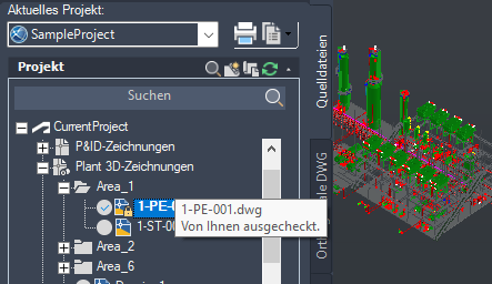 Projektdateien sind im Arbeitsbereichsordner zunächst schreibgeschützt. Der Projektmanager fordert Sie auf, die zu bearbeitenden Dateien auszuchecken. Wenn Ihre Änderungen abgeschlossen sind, können Sie Projektdateien einchecken. Sie können auch eine Synchronisierung mit dem Vault durchführen, um Ihre laufende Arbeit freizugeben, ohne die Dateien einzuchecken.
