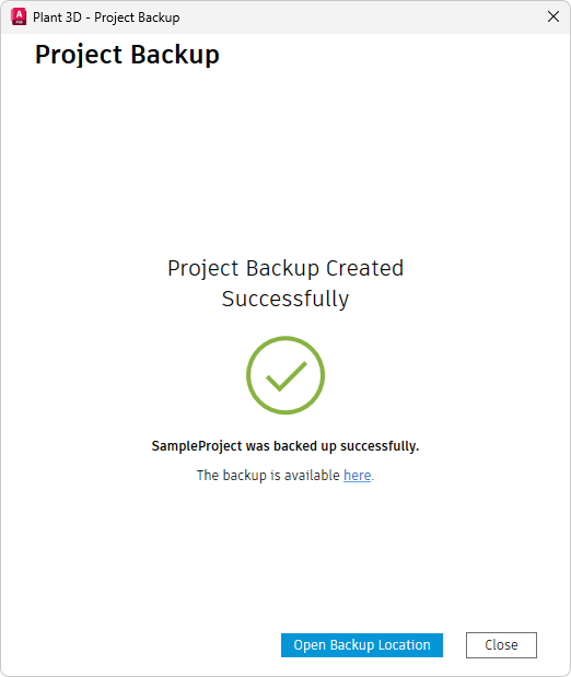 Das Sichern ist besonders bei Zusammenarbeitsprojekten nützlich, da Sie so eine lokale Kopie Ihres vorhandenen Zusammenarbeitsprojekts erstellen können und eine aktuelle Version zur Verfügung haben. Wenn die Projektkonfiguration oder Zeichnungen von anderen Benutzern in Zusammenarbeitsprojekten ausgecheckt werden, wird eine Warnmeldung angezeigt. Sie können die Sicherung dennoch durchführen, nicht gespeicherte Änderungen werden jedoch nicht berücksichtigt.