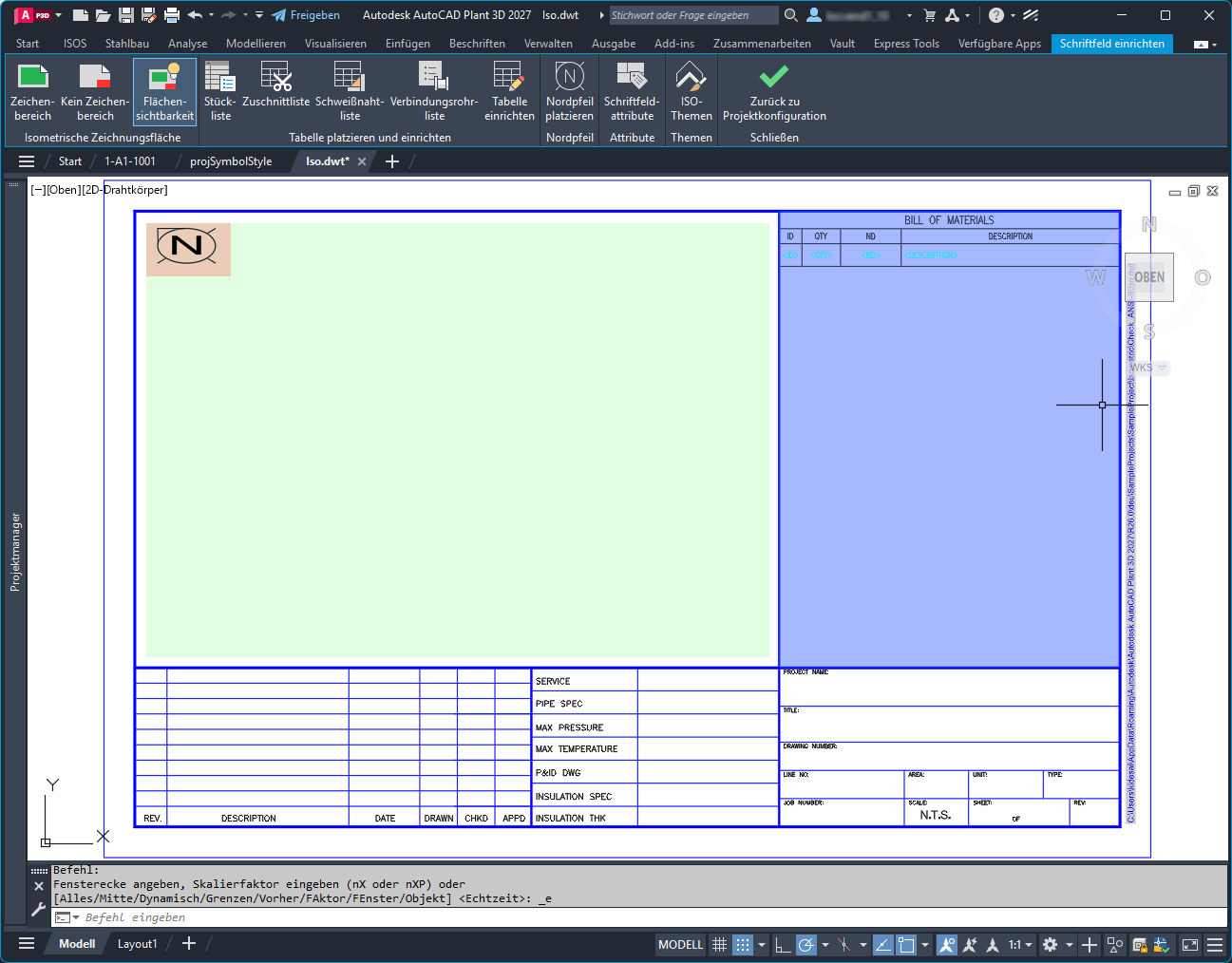 Nach dem Klicken auf die Schaltfläche Schriftfeld einrichten in der Projektkonfiguration (Knoten Schriftfeld und Anzeige) können Sie die Schriftfeldzeichnung direkt bearbeiten oder die Werkzeuge in der kontextabhängigen Multifunktionsleiste verwenden. Hier steht Ihnen die Konfigurationsumgebung zur Verfügung: