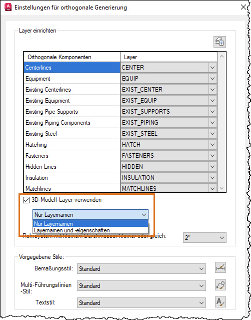 Anstatt Layer manuell festzulegen, können Sie die Option 3D-Modell-Layer verwenden aktivieren, damit orthogonale Objekte die Layer direkt aus den ursprünglichen 3D-Modellen übernehmen können. Sie können auch auswählen, ob Sie nur die Layernamen anzeigen oder sowohl die Layernamen als auch die zugehörigen Eigenschaften angeben möchten.